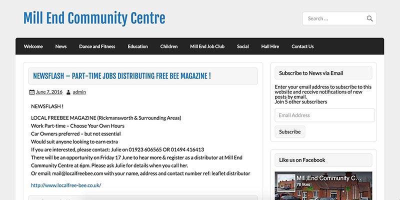 The Mill End CC was looking for a volunteer to make them a new website and I put my name forward. The site is built on Wordpress so I set it up with a new theme, menu, widgets and personalised the design